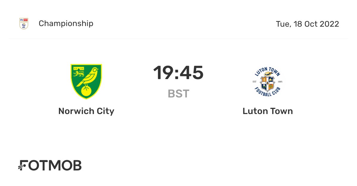 Luton Town 3 - 1 Queens Park Rangers View events. 01 Luton Town FC. Norwich City is going head to head with Luton Town starting on 18 Oct 2022 at 1845 UTC at Carrow Road stadium Norwich city England.